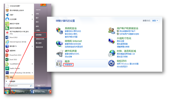 1.点击开始,打开控制面板,找到“卸载程序”,如下图: