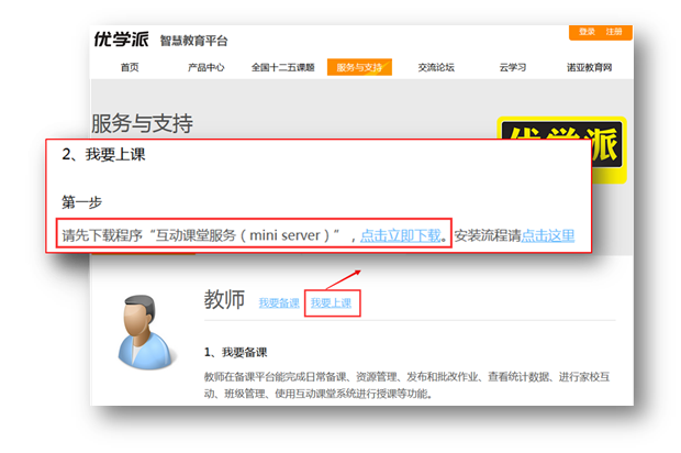 1. 进入优学派主页:https://www.youxuepai.com,找到“服务与支持”,如下图: