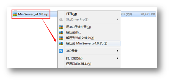 3. 找到下载到本地的压缩包MiniServer_v4.0.8.zip,右键进行解压,如下图: