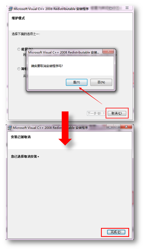 5. 弹出页面提示框“维护模式”,选择“取消”,点击“是”,最后点击“完成”,如下图: