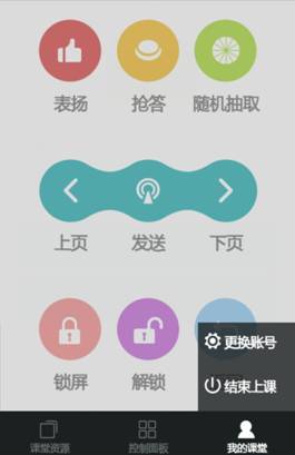 6、在控制面板界面,可对互动课堂进行控制:互动课件翻页、发送互动组件、发起抢答及随机抽取、进行表扬、锁屏/解锁。
